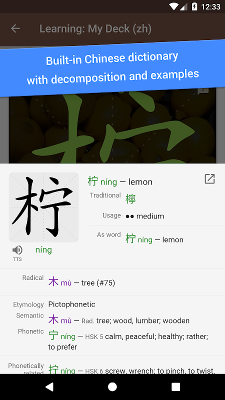 • dizionario incorporato con decomposizione carattere, pronuncia audio, e gli esempi;