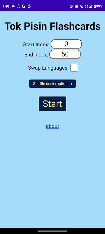 Lo scopo di questa app è aiutarti a memorizzare alcune espressioni comuni e parole utili del vocabolario nella lingua Tok Pisin (a volte chiamata Pidgen della Nuova Guinea o semplicemente Pidgen), parlata in Papua Nuova Guinea. Per utilizzare l'app, specifica semplicemente l'intervallo di carte che desideri scorrere dall'intero set. Puoi anche cambiare la lingua visualizzata per prima attivando la casella di controllo "Cambia lingua". Clicca su "Start" e le flashcard dell'intervallo selezionato verranno mescolate. Cliccando sulla carta in cima alla pila, la risposta verrà rivelata e la carta verrà spostata verso il basso, eliminandola. Cliccando di nuovo sulla carta dopo che è stata rivelata, questa verrà spostata in una pila "da ripetere" in modo da poterla ripetere in seguito.