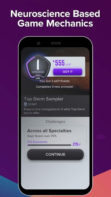 Top Derm è supportato da meccaniche di gioco basate sulle neuroscienze che ti aiutano ad acquisire e conservare le conoscenze. È anche un sacco di divertimento e pronto per andare sul tuo telefono in qualsiasi momento. Quindi, che tu sia tra un paziente, in pausa pranzo o semplicemente seduto per rilassarti, Top Derm ti sta aspettando.