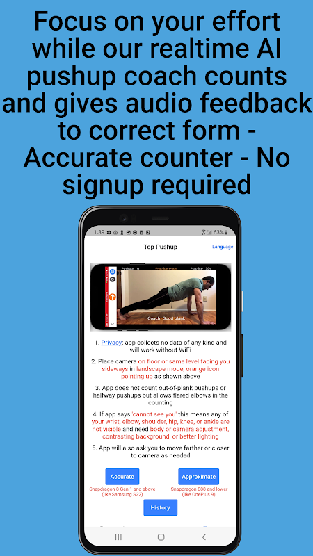 🗣️ Apri l'app, posiziona il telefono sul pavimento o allo stesso livello di fronte alla tua vista laterale coprendo la testa ai piedi e inizia a fare la tua routine di flessioni. Regola la distanza dalla videocamera come dice l'app e regola lo sfondo e l'illuminazione se l'app ha problemi a vedere i tuoi punti chiave. Quindi Top Pushup AI analizza istantaneamente ogni pushup e fornisce un feedback audio dal vivo. Se un pushup è stato eseguito nella forma corretta della plancia, l'app lo conterà. Se i tuoi gomiti sono svasati, l'app conterà comunque il pushup ma ti dirà di piegare i gomiti. Se il modulo è sbagliato o fai un mezzo pushup, l'app non conterà il pushup e il nostro coach AI ti informerà immediatamente e ti dirà cosa migliorare. È come avere un vero personal trainer per flessioni accanto a te.