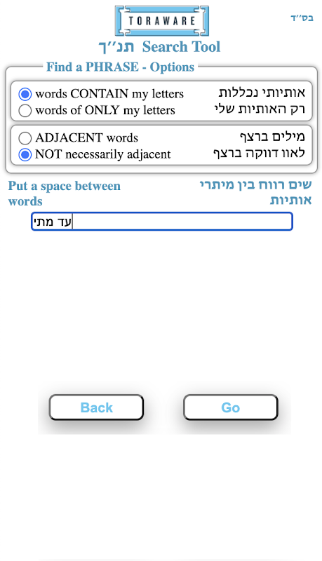 In 2 o 3 clic puoi trovare qualsiasi WORD o frase, istantaneamente. Scegli il metodo, scegli un'opzione o due, inserisci il testo ebraico e vai. (Nota: avrai bisogno dell'input da tastiera ebraica.) Ti sei mai chiesto "Dov'è la menzione di un testo" o "Quante volte appare una parola"? E soprattutto per gli studenti della Torah, questo abile strumento di riferimento è perfetto per te.
