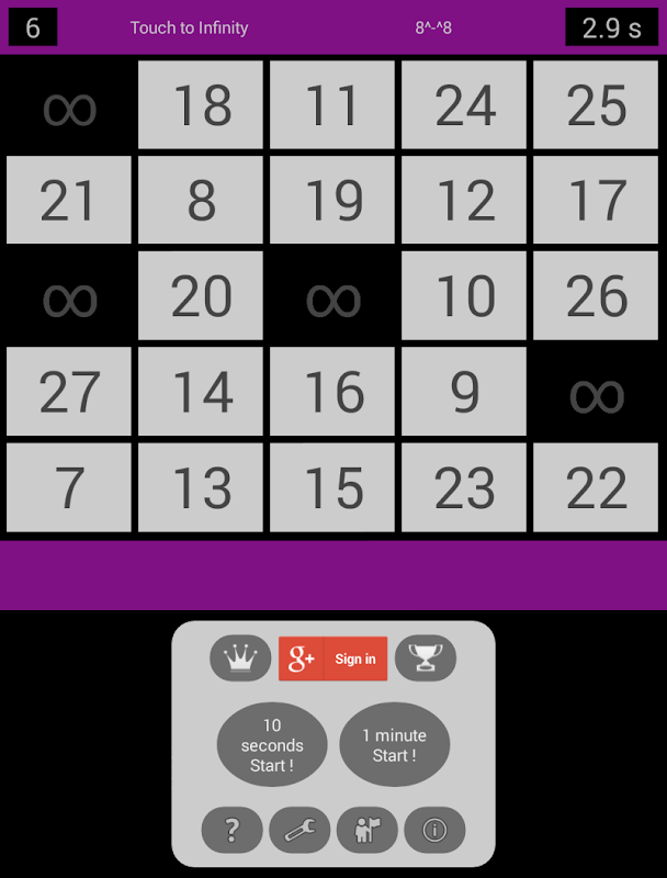 As you know, there is a famous game Touch cells numbering from 1 to 25. "Touch to Infinity" is for those who unsatisfactory up to 25. You can touch Indefinitely numbers.