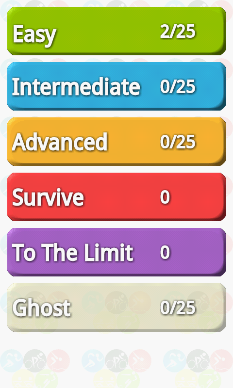 There is a list of the best times for each game mode. In modes Easy, Intermediate, Advanced and Ghost you get time to upload to Ranking when you complete all game levels. Total time is the sum of every level time. In Survive and To The Limit modes times can be uploaded from the first result.