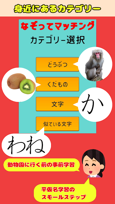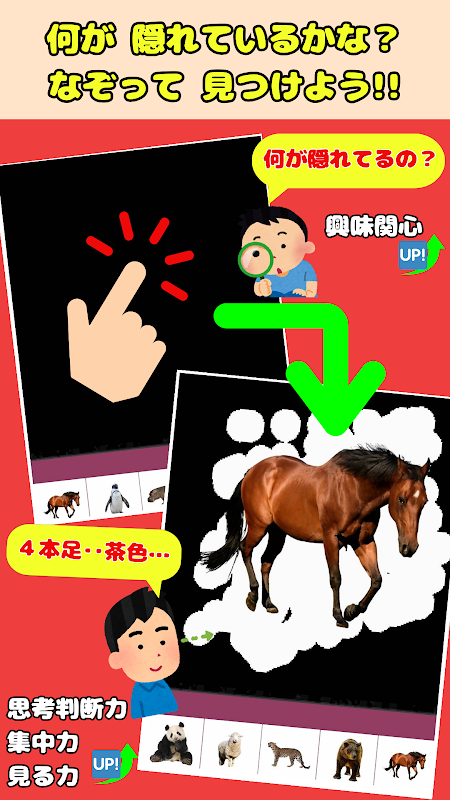 Nell’istruzione, nascondere l’oggetto dell’attenzione è un metodo comune per coinvolgere gli studenti. Invece di dire "Guarda qui", nascondere gli oggetti attira naturalmente l'attenzione dei bambini, favorendo la loro motivazione intrinseca. Il pubblico a cui è rivolta questa app sono i bambini da 0 a 6 anni. Questa app funge da strumento efficace per i bambini che affrontano difficoltà nella lettura o nella scrittura dell'hiragana. Prima di imparare a scrivere l'hiragana, è essenziale sviluppare le abilità con la matita. Anche se un bambino non riesce a tenere in mano una matita, tracciare sullo schermo può allenare le sue dita, sviluppando competenze fondamentali. Ciò alimenta anche il processo decisionale cognitivo. Per i bambini che trovano difficile stare da soli, interagire con i tutori può migliorare il vocabolario e la comunicazione. Anche per i bambini di 0 o 1 anno, il semplice rapporto causa-effetto realizzato toccando o scorrendo lo schermo fornisce informazioni preziose.