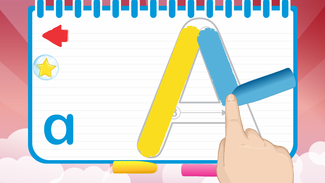 – Scrivere le lettere ABC sulla carta con colori diversi dove si viene premiati con 3 stelle se si scrive correttamente la lettera, e in caso di errore si può usare la gomma.