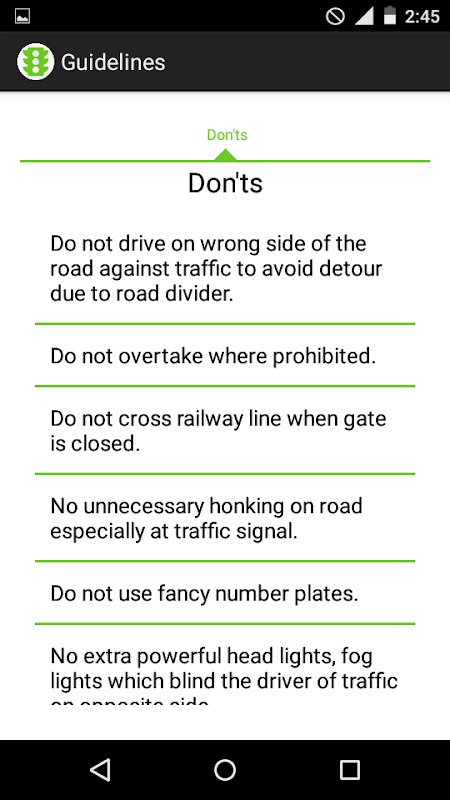 This app works on the concept of One rule in one day. Though user can view all the rules at once, but if you learn one rule one day and practice it, soon you will be following all traffic rules without problem, and as a result problems related to traffic will be minimized.