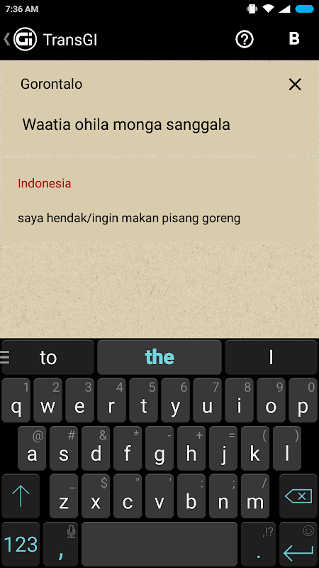 TransGI adalah aplikasi offline penerjemah teks dua arah Indonesia - Gorontalo.