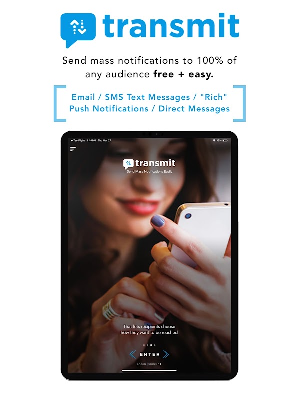 Transmit rende semplice e gratuito l'invio di notifiche di massa al 100% di qualsiasi pubblico utilizzando il nostro rivoluzionario sistema di messaggistica 4 in 1 che ti consente di inviare un singolo messaggio, che viene consegnato tramite: