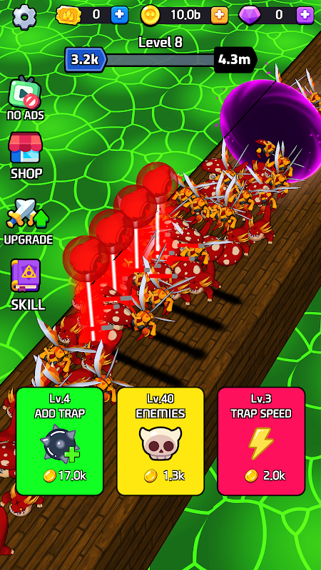 **4. Migliora e potenzia:** Migliora il tuo gameplay potenziando le trappole, aumentando il tasso di generazione dei nemici, aumentando la velocità e il danno delle trappole e migliorando il tasso di rilascio delle gemme. Personalizza le tue difese per adattarle al tuo stile di gioco.