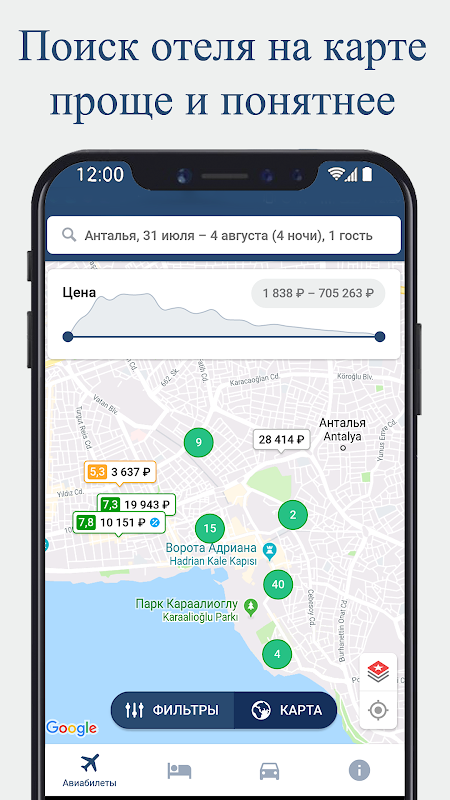 Il viaggio non termina con un volo verso un paese o una città. Per l'alloggio, cerca gli hotel nell'applicazione contemporaneamente su HOTELS.COM, EXPEDIA, OSTROVOK, TRAVEL.RU, HOTELLOOK e in altri 80 sistemi di prenotazione online!