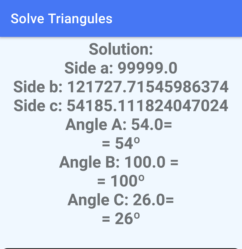 Pertanto, in primo luogo l'utente deve introdurre tre valori (uno dei quali deve essere un lato). L'app utilizzerà il teorema del coseno e del teorema del seno (e la somma dei 3 angoli del triangolo è 180 gradi) per calcolare gli altri tre valori.