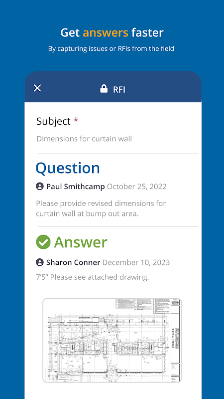 Con ProjectSight puoi costruire meglio, semplificare la documentazione e collegare l'ufficio al cantiere. Per ogni appaltatore, dai piccoli team alle grandi aziende, l'applicazione mobile di ProjectSight ti consente di accedere alle informazioni di progetto di cui hai bisogno, ovunque ti trovi.