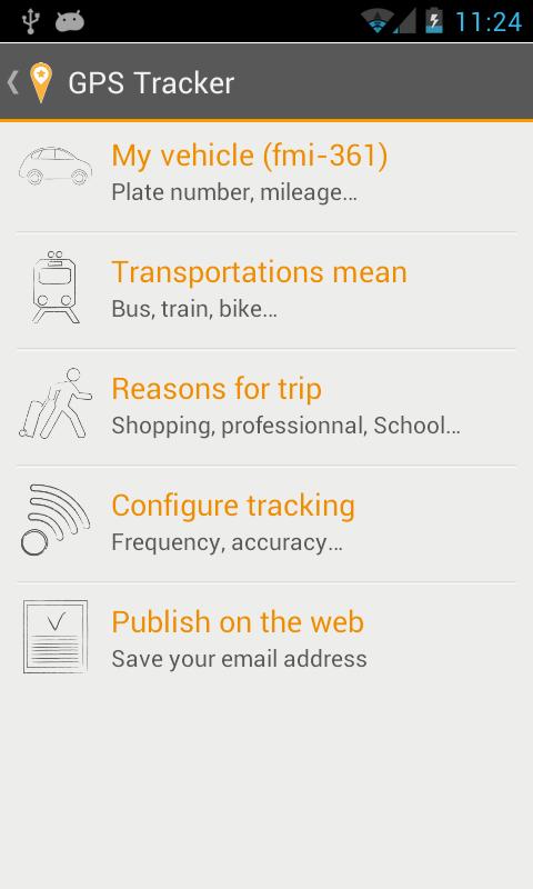 2. Configure your vehicle, other means of transportation, the reasons for your trip and your GPS tracking options. You are ready!