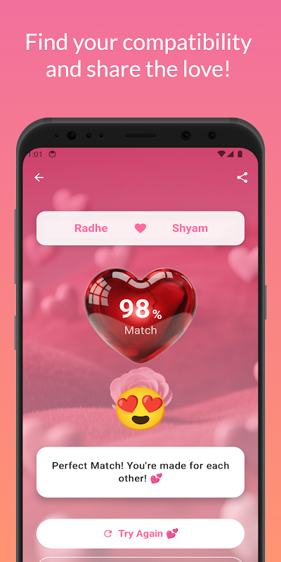 Scopri il tuo destino amoroso in pochi secondi con True Love Calculator: FLAMES! Che tu sia curioso di conoscere la tua cotta, l'anima gemella o il partner, questa app ti aiuta a calcolare la tua compatibilità istantaneamente in modo divertente e interattivo. Usa il classico metodo FLAMES (Amico, Amore, Affetto, Matrimonio, Nemico, Sorella) per analizzare il potenziale della tua relazione.