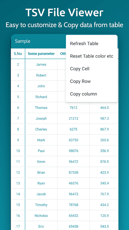 TSV file reader display tsv file content in tabular format. You can easily customize the table by changing its font size, text color, table background color and table selected cell color. TSV viewer allow you to copy data of any selected row, column or cell. Through TSV file reader you can easily navigate to any line number or search anything within table.