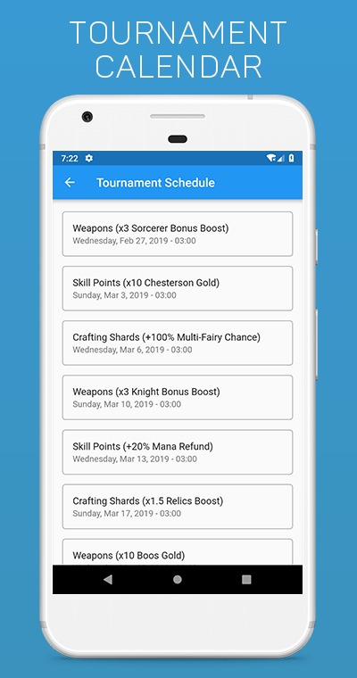 - Widgets for the current (or previous) and next tournament on the main screen;