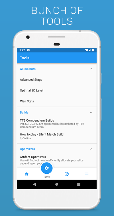 The main goal of the application is to gather useful information about the Tap Titans 2, help newcomers and other players to advance and get additional helpful tools :)