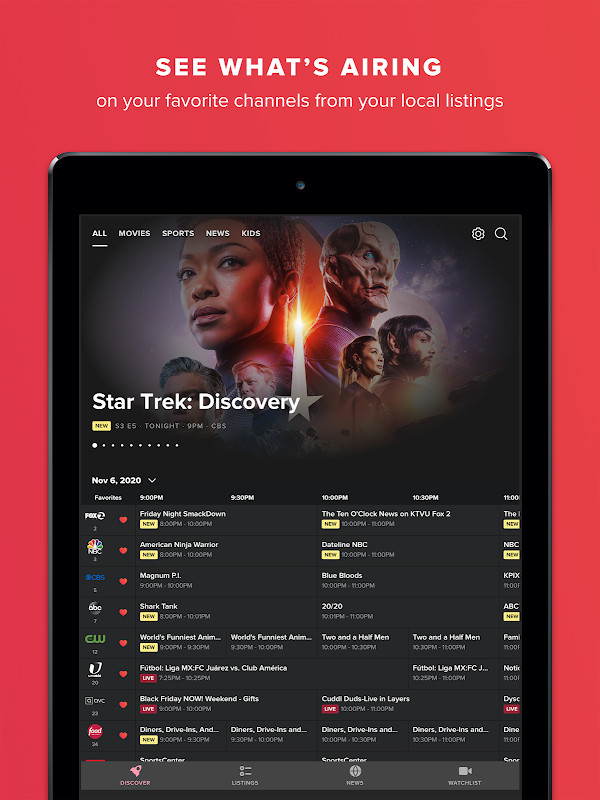 • NOVITÀ STASERA: guarda i nuovi migliori programmi in prima serata in onda sia su trasmissione che via cavo, tra cui CBS, NBC, ABC, Fox, Ion, HGTV, Hallmark, USA Network, History, TLC, TBS, Discovery, TNT, The CW e A&E .