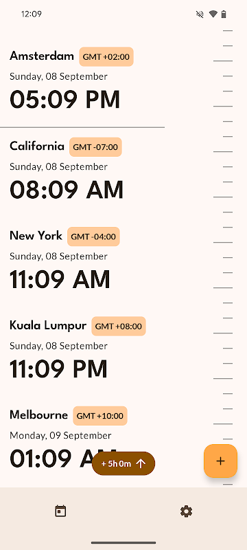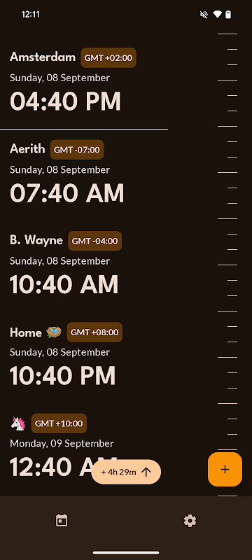 Il cursore che sembra un nastro di misurazione, fai un giro e ti trasporterà nel tempo. Puoi vedere immediatamente l'ora locale dei fusi orari salvati e il loro andamento. Quindi, puoi finalmente fare una chiamata con quello dei tuoi amici senza svegliarlo accidentalmente.