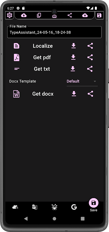 6. Opzioni di salvataggio file: Salva il testo registrato o tradotto nei formati PDF, TXT e DOCX per comodità.