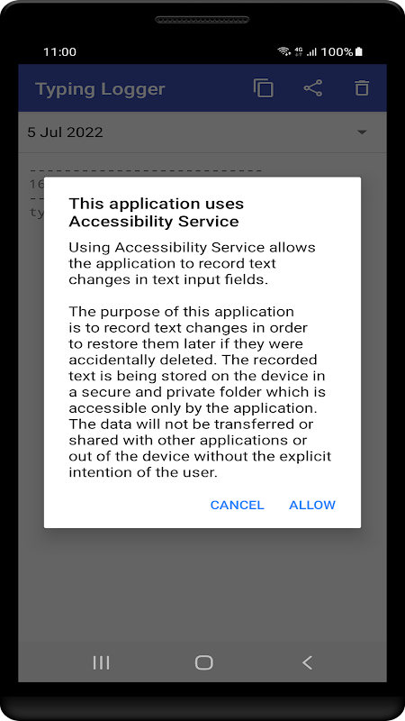 Il servizio di accessibilità «Typing Logger» deve essere attivato manualmente affinché questa applicazione possa funzionare correttamente. L'utilizzo del servizio di accessibilità consente all'applicazione di registrare le modifiche al testo nei campi di immissione del testo. Sono esclusi dalla registrazione password e testo nelle applicazioni sensibili.