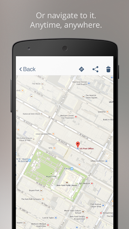 • An address or Google Maps URL—then drive there with your favorite navigation apps on your mobile.