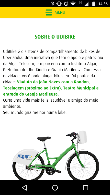 UdiBike é o sistema de compartilhamento de bikes de Uberlândia. Uma iniciativa que tem o apoio e patrocínio da Algar Telecom, em parceria com o Instituto Algar, Prefeitura de Uberlândia e Granja Marileusa. É possível alugar bicicletas em 04 pontos da cidade: Viaduto da João Naves com a Rondon, Tecelagem, Teatro Municipal e entrada do Granja Marileusa.