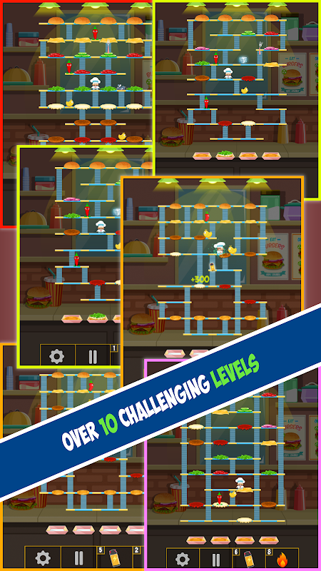 The objective of the Ultimate Burger game is to help a chubby little chef run up, down, and across floors in order to create a burger, while it’s still being chased by the enemies like red chilli, bird, fork, and rat. These enemies can be dodged away or crushed by a falling ingredient. You can also manipulate them towards an ingredient and cause it to fall on them.