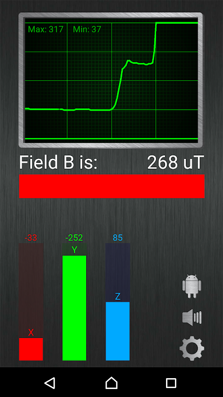 Questa app utilizza il sensore magnetico (bussola) del tuo telefono e visualizza la lettura con una linea di LED e un classico misuratore ad ago. È possibile passare da un'unità di misura all'altra (uTesla e Gauss) e modificare l'intervallo di misurazione dalle impostazioni.