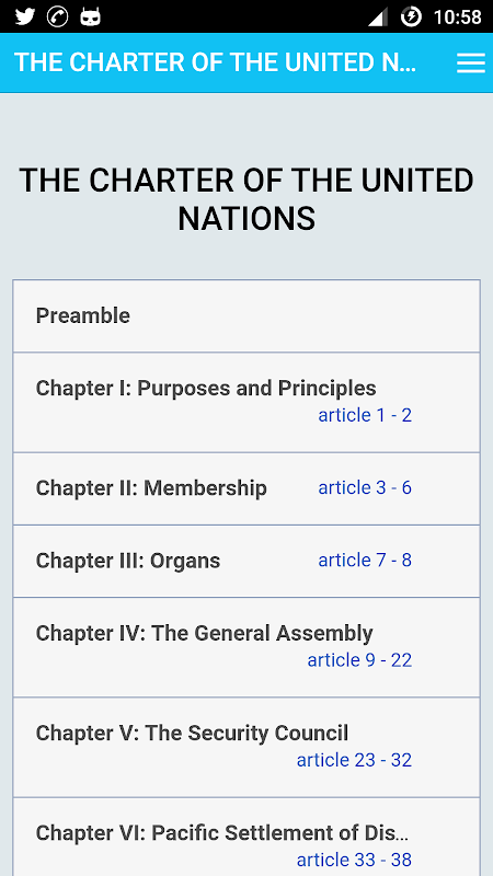 UN Charter is an application which presents the articles of The Charter of the United Nations which was signed on 26 June 1945, in San Francisco, at the conclusion of the United Nations Conference on International Organization, and came into force on 24 October 1945.