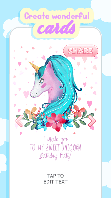 Crea i tuoi inviti per unicorno con l'app della cartolina! Divertiti a preparare i tuoi festeggiamenti in modo semplice grazie al creatore di inviti con foto! Sognante gli unicorni miglioreranno il tuo evento con la loro forma e design kawaii! Inviti di compleanno per ragazza unicorno gratuiti dal design sofisticato ti lasceranno senza parole! Impara come fare 🦄Inviti per feste di compleanno unicorno🍧 nel modo più semplice con questa app di progettazione di inviti! Mostra a tutti quanto sei creativo con il tuo nuovissimo creatore di inviti alle feste con foto!