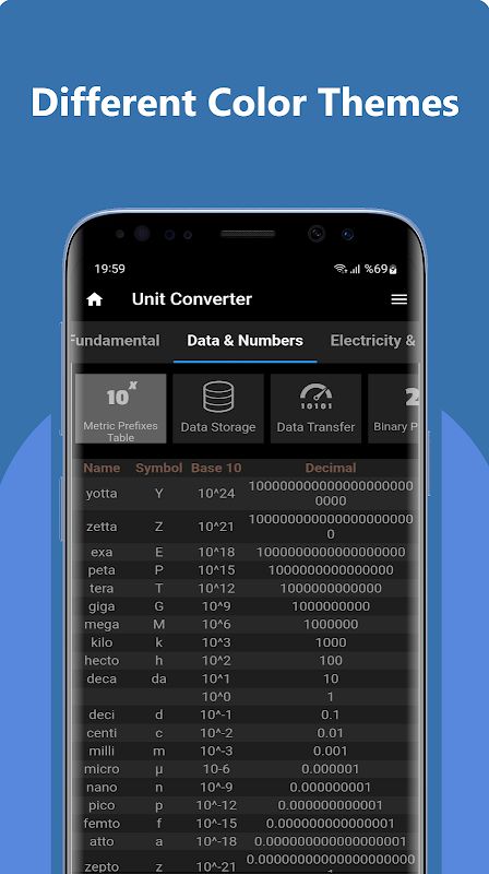 Questo è un convertitore di unità di ingegneria, quindi puoi modificare il formato del numero, la notazione esponenziale e copiare facilmente i risultati. L'interfaccia ti consente di vedere tutti i risultati del convertitore contemporaneamente. L'app viene fornita con 5 temi di colore diversi, incluso uno scuro.