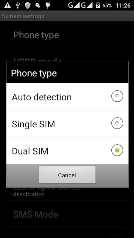 La modalità USSD 0 è adatta alla maggior parte dei telefoni tranne MTK 6573 e Samsung Duos. La modalità USSD 1 è adatta alla maggior parte dei telefoni su MTK 6573.