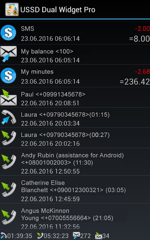 Equilibrio del widget tramite query USSD e SMS con possibilità di analisi e possibilità di aggiornamento automatico. È disponibile un supporto per smartphone Dual SIM. Capacità di gestire le notifiche push. Richieste USSD impercettibili su smartphone con root.