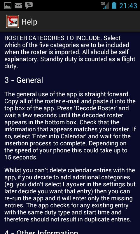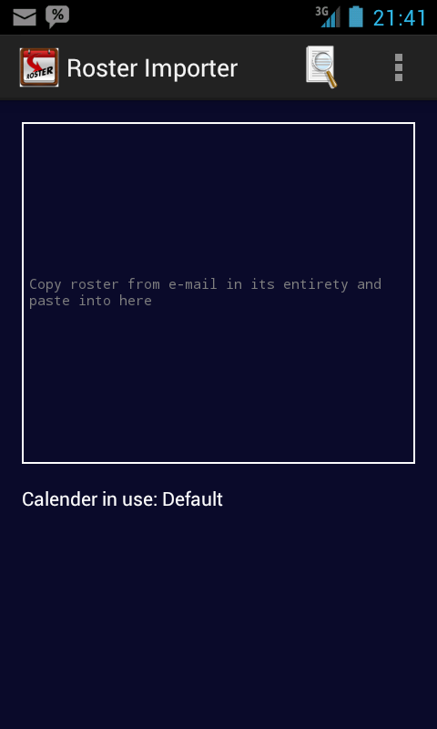 Virgin Australia nazionale condotta e di cabina hanno bisogno di un modo semplice per ottenere che quattro settimane roster nel loro calendario Android. Fino ad ora si erano bloccati con inserimento manuale o di dover mettere tutto in e quindi l'eliminazione di quello che non vuole. Roster Importatore risolve tale. Basta prendere il roster che è l'e-mail a voi e copiare e incollare in questa applicazione. Poi, con un clic di un pulsante calendario è popolata con gli eventi che si sceglie.