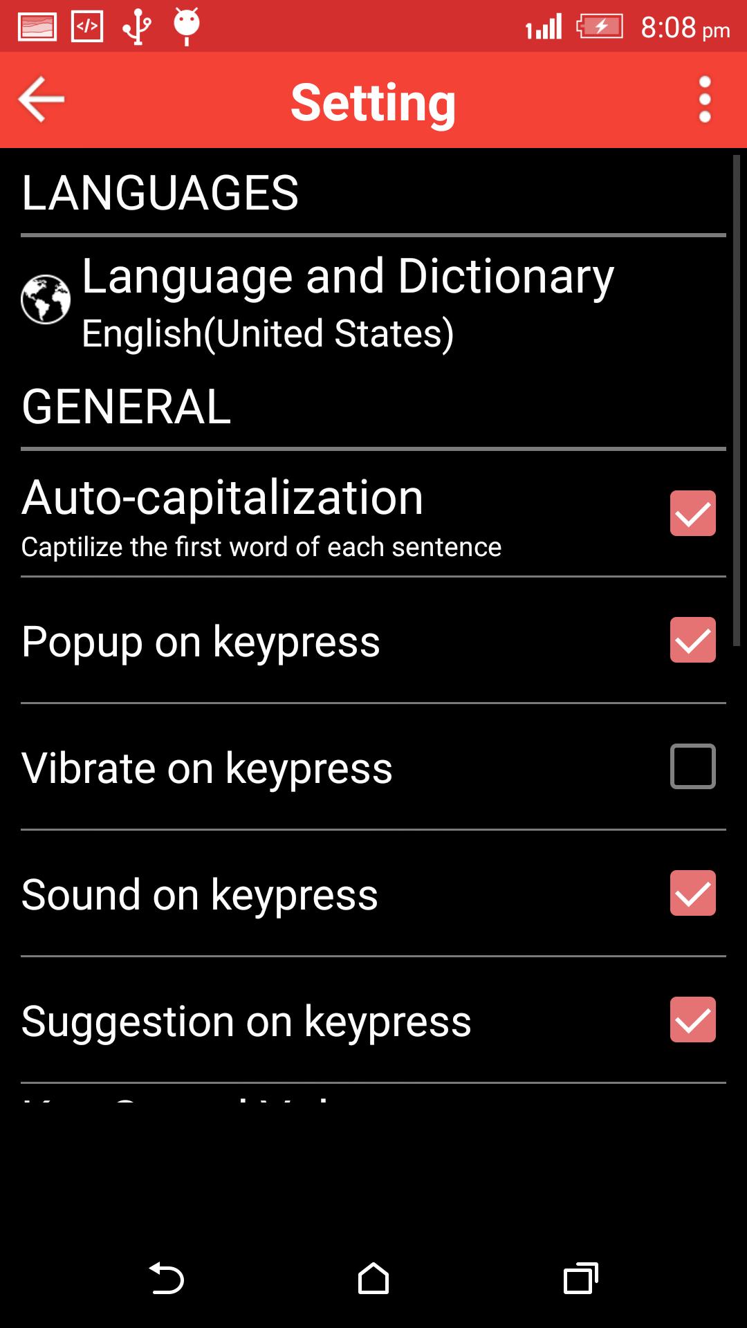 * Keyboard Key press setting as sound, vibration etc.