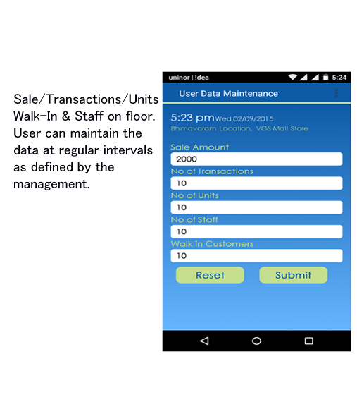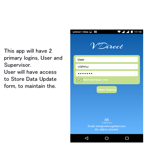 V_Direct Retail app will have 2 Primary logins, User and Supervisor. User will have access to Store Data Update form, to maintain the Sale/Transactions/Units/Walk-In & Staff on floor. User can maintain the data at regular intervals as defined by the management.