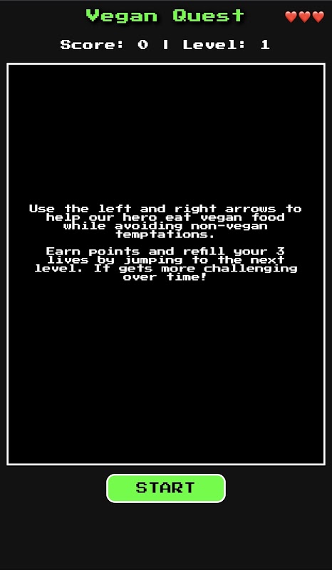 In Vegan Quest, il tuo compito è semplice ma impegnativo: raccogli il maggior numero possibile di prodotti alimentari vegani evitando le tentazioni non vegane. Ogni pezzo di cibo vegano che catturerai ti farà guadagnare 20 punti. Ma attenzione! Ogni oggetto non vegano che raccogli accidentalmente ti costerà una delle tue 3 vite. Avanza al livello successivo per riempire le tue vite.