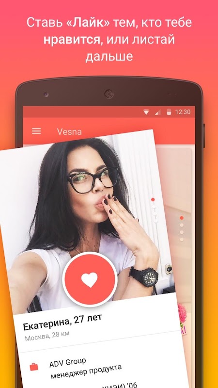 Vesna - это лучший способ найти интересных, классных людей поблизости и завязать новые знакомства и пойти на свидание. И абсолютно бесплатный. Просматривай тех, кто находится рядом и выбирай того, кто тебе нравится. Если ты тоже понравишься этому человеку, то, считайте, что ваше знакомство состоялось: общайтесь в чате и назначайте свидания.