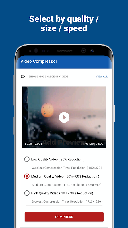 Supporta la compressione video singola e multipla in una volta sola. Visualizza l'anteprima dei video compressi con l'app e salvali nella galleria.