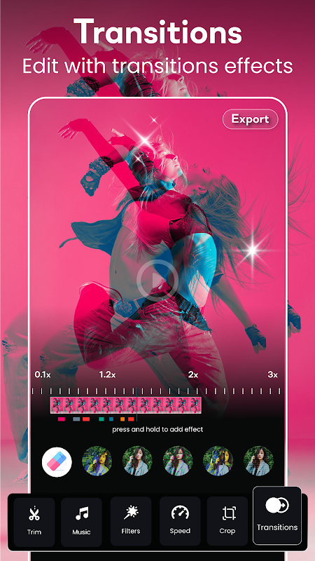 Video Maker and Video Editor è l'ultimo Video Cutter con strumenti di editing video professionali per creare vlog eleganti con potenti funzionalità di editing video. L'editor fornisce una serie di strumenti di modifica video e ritaglio video, taglio, ritaglio video, effetti di transizione foto, Video Collage Maker, testo, unione, emoji, glitch e filtri veloci, sfocatura sfondo, clip grafica, foto con musica e rallentatore ecc. video maker con una canzone puoi modificare video con filtri e condividere video in qualsiasi momento.