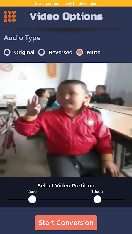 2 Select the duration you want to cut and reverse , Select audio type (Reverse, Original, Mute) that your result will have..