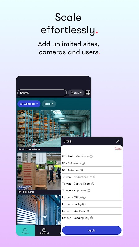 Non dovrai più gestire più registratori, accessi o app. L'app mobile di visualizzazione CCTV basata su cloud e il VMS basato su web di Videoloft riuniscono tutte le tue telecamere, di marchi, registratori e siti diversi, in un'unica piattaforma centrale. Perfetto per le aziende che gestiscono la sicurezza in uffici, catene di vendita al dettaglio, magazzini o campus.