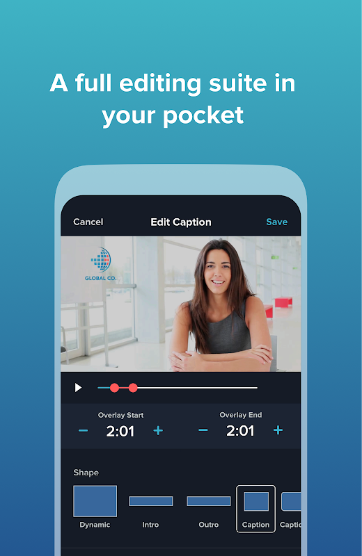 E 'facile da modificare all'interno della app VideoMyJob. Lo strumento di editor video consente di ritagliare filmati aggiungere didascalie e personalizzare il branding.