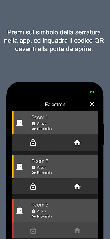 Una volta davanti alla porta della tua camera, oppure per aprire eventuali varchi esterni alla struttura o di accesso a servizi comuni, premi sul simbolo della serratura nella app, ed inquadra il codice QR davanti alla porta da aprire.