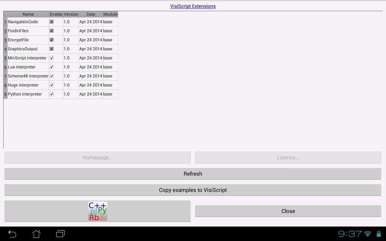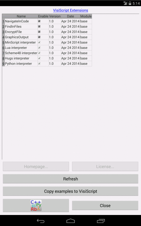 L'autore di questa app non è responsabile del comportamento degli interpreti di script Lua, Python, Scheme48, Hugs e newLisp. Selezionare un modulo di estensione nell'elenco e attivare il pulsante Licenza per ulteriori informazioni sul modulo di estensione.