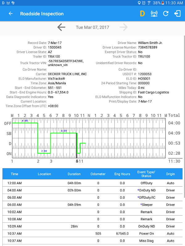 VisTracks ™ Ore di servizi è un servizio basato su tablet potente ma facile da usare certificati con gli Stati Uniti Dipartimento dei Trasporti federale Motor Carrier Safety Administration (FMCSA) norme per i registri elettronici e le ispezioni del veicolo. Regolamento per i registri di guida e di controllo del veicolo elettronici sono diventati comuni al fine di garantire la veridicità di ingresso driver della tavoletta e ha assicurato la conformità alle normative. VisTracks Ore di servizio è conforme alle normative federali e statali, nonché i regolamenti canadesi.