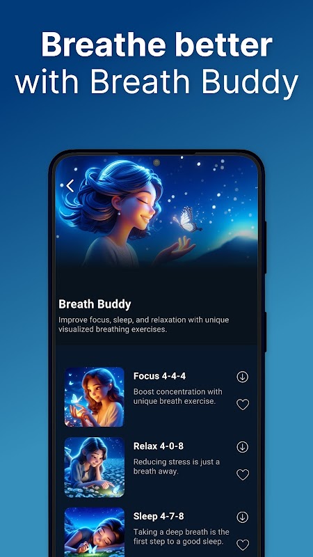 Con questa app per la respirazione, puoi eseguire facilmente diversi esercizi di respirazione come Focus 4-4-4, Relax 4-0-8, Sleep & Depression 4-7-8 e Immmunity Strengthening 4-4-8. Mentre fai esercizi di respirazione in questa app per allenatori di respiro, le animazioni che abbiamo preparato con cura creeranno un'esperienza più tranquilla per te. È ora di respirare!