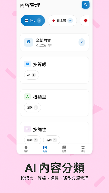 2. Gestione intelligente dei materiali didattici, classificazione automatica per lingua, difficoltà, parti del discorso, ecc.
