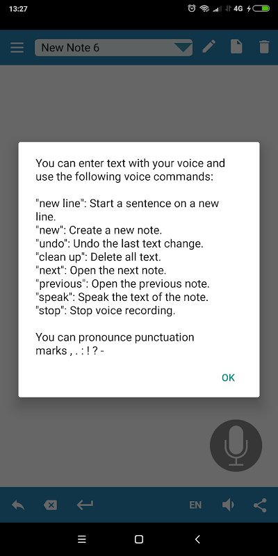 L'intero processo può essere controllato utilizzando i comandi vocali: cancella l'ultima frase, cancella il testo della nota, inizia una nuova riga. Vengono riconosciuti anche i segni di punteggiatura. Inoltre, puoi usare la tua voce per creare una nuova nota, per aprire la nota successiva o precedente e così via.